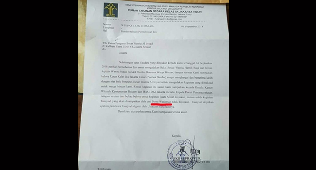 “ Tausiyah diizinkan apabila pembawa tausyiah diganti dengan ustazah lain,†tukas surat Suprapti tersebut.