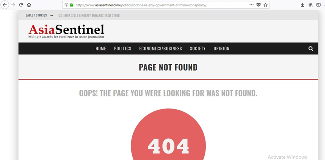 Saat ini artikel tersebut telah hilang atau dihapus dari media Asia Sentinel.
