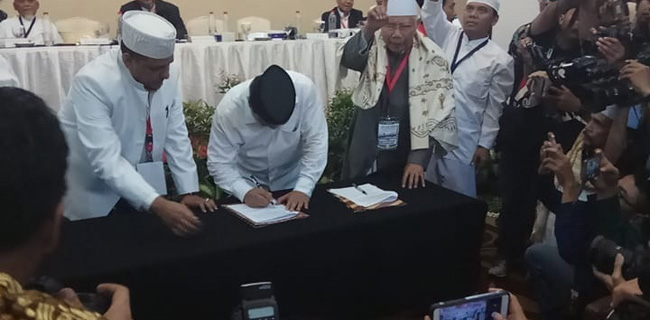 Prabowo yang didampingi perwakilan partai koalisi pendukungnya menandatangani sebanyak 17 poin yang disaksikan seluruh peserta Ijtima Ulama II.
