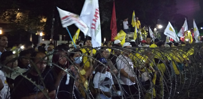 Semangat para relawan seolah tiada henti sejak lepas magrib tadi. Walaupun, orasi kencang mereka terhadang pagar kawat berduri yang sudah terpasang.