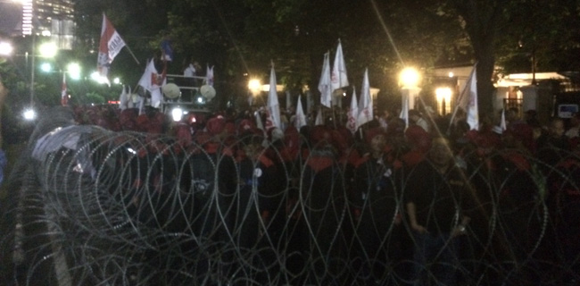 Barisan buruh sudah berkumpul sejak sore tadi menunggu kedatangan Prabowo-Sandi di KPU, Jalan Imam Bonjol, Menteng, Jakarta Pusat, Jumat (21/9).