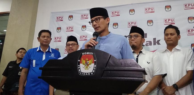 "Jangan dibandingkan dana kampanye dengan tokoh sebelah lah," ujar Sandi di Kantor KPU, Menteng, Jakarta, Minggu (23/9).