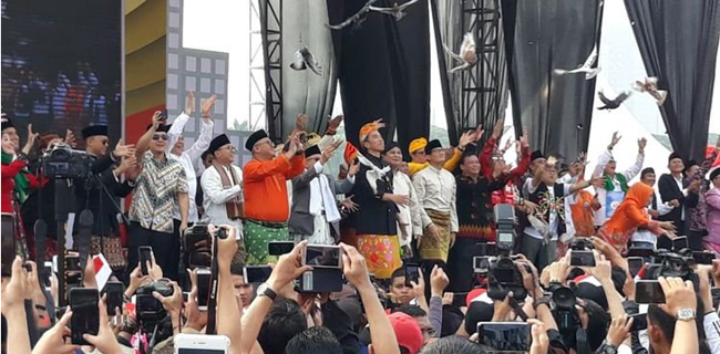 Deklarasi Kampanye Pemilu Damai 2019 di Lapangan Monumen Nasional, Jakarta (Minggu, 23/9) dimulai dengan pelepasan burung merpati oleh seluruh kontestan baik calon presiden, calon legislatif, calon anggota DPD , juga para ketua umum partai.