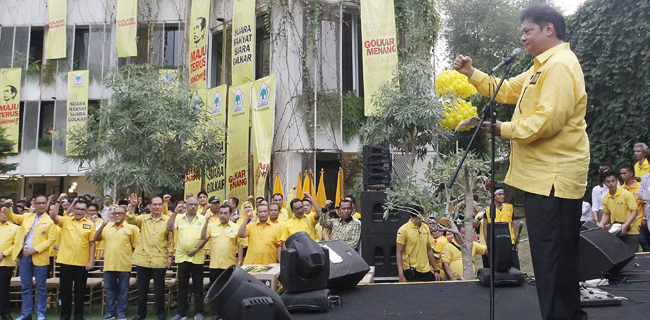 Ketua Umum Partai Golkar, Airlangga Hartarto memberikan sambutan disaksikan pengurus saat pelepasan resmi Caleg DPR RI DKI Jakarta dan peluncuran tagline kampanye partai "Suara Rakyat, Suara Golkar" di kantor DPD I Partai Golkar, Jakarta Pusat, Minggu (23/8). Dwi Pambudo/RM