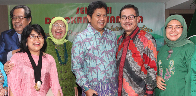 Koordinator Majelis Nasional Forum Alumni HMI Wati (FORHATI) Hanifah Husein (ketiga dari kiri), Presidium KAHMI yang juga Wakil Ketua Komisi IV DPR dari Fraksi PAN Viva Yoga Mauladi (ketiga dari kanan), pengajar/mentor SDIC N. Syamsudin Ch. Haesy (kiri) dan mantan Ketua PB HMI Ferry Mursyidan Baldan (kedua dari kanan) berfoto bersama dengan peserta "Sekolah Demokrasi Insan Cita" (SDIC) saat pembukaan SDIC untuk para alumni HMI Wati (KAHMI Wati), di Jakarta, Rabu (26/9).