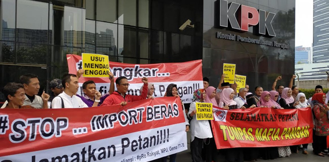 "Indonesia dibanjiri impor pangan yang menyengsarakan petani. Usut Mendag Enggar. Stop impor beras yang sengsarakan petani," ujar Koordinator Delegasi Gema 77-78 Syafril Sjofyan di Gedung KPK, Jakarta, Kamis (27/9).