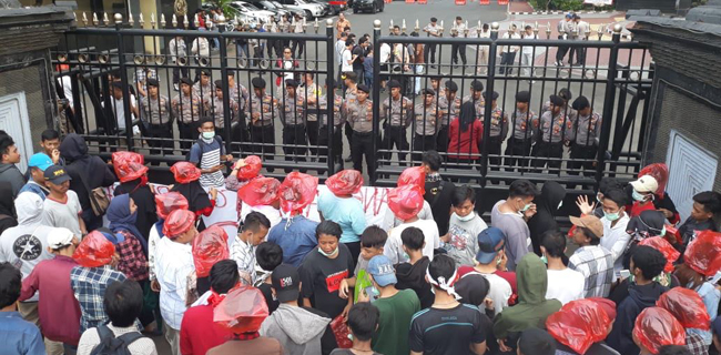 Massa FAMI yang berdemo di depan kantor PMJ nampak di antaranya anak-anak usia remaja dan orang tua. Mereka membawa 10 bendera merah putih yang masing-masing diikat pada sebilah bambu.
