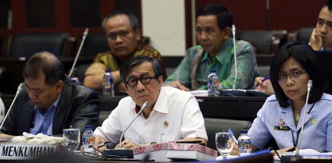 Menteri Hukum dan Hak Asasi Manusia (Menkumham), Yasonna Laoly (tengah) didampingi sejumlah pejabat Kemenkumham mengikuti Rapat Kerja dengan Badan Legislasi DPR, di Gedung Nusantara I, Komplek Parlemen, Senayan, Jakarta, Selasa (23/10). Dalam Raker yang diikuti juga oleh perwakilan Dewan Perwakilan Daerah (DPD) tersebut membahas usulan Rancangan Undang-Undang (RUU) yang menjadi prioritas dalam Program Legislasi Nasional (Prolegnas) 2019. Tedy Kroen/RM