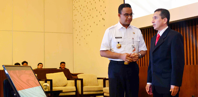 Gubernur DKI Jakarta, Anies Baswedan berbincang dengan Direktur Eksekutif Pusat Mediasi Nasional (PMN), Fahmi Shahab di sela-sela pembukaan Konferensi Asian Mediation Association (AMA) ke-5 di Jakarta, Rabu (24/10). Konferensi ini diharapkan memberi banyak kesempatan untuk bertukar pikiran tentang ide-ide baru dan perkembangan terakhir di bidang mediasi untuk mencegah konflik meningkat menjadi pertempuran. Dwi Pambudo/RM