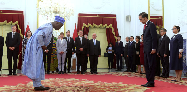 Satu persatu para Dubes bersalaman dengan Jokowi sapaan akrab Kepala Negara itu sambil menyerahkan langsung surat kepercayaan tersebut.