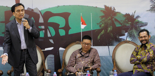 Anggota Komisi I DPR dari Fraksi PDIP, Effendi Simbolon (kiri) bersama Ketua Dewan Pers Yoseph Adi Prasetyo (tengah) dan analis politik Boni Hargens (kanan) menjadi pembicara dalam diskusi Dialektika Demokrasi dengan tema "Menjaga Independensi Media Jelang Pilpres 2019", di Gedung Nusantara III, Komplek Parlemen, Senayan, Jakarta, Kamis (8/11). Mereka menyoroti soal afiliasi sejumlah media terhadap kelompok politik tertentu, hal ini yang membuat media diragukan netralitasnya, sehingga muncul gerakan boikot terhadap media yang dilakukan oleh mereka yang merasa dirugikan atas pemberitaan yang disiarkan. Tedy Kroen/RM