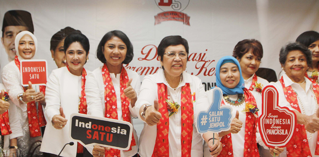 Sejumlah perempuan yang tergabung dalam Perempuan Kreatif, Enerjik, Religius dan Nasionalis (Keren) Bravo 5 menyatakan dukungan untuk pasangan Capres dan Cawapres nomor urut 01, Joko Widodo-Ma'ruf Amin di Jakarta, Kamis (7/11). Para perempuan Bravo 5 menganggap pemerintahan Jokowi-JK telah berhasil menyokong peran perempuan dalam membangun Indonesia yang lebih baik. Dwi Pambudo/RM