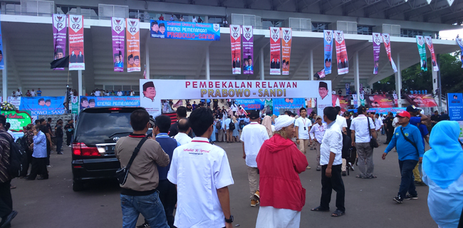 Relawan pendukung pasangan Prabowo Subiyanto-Sandiaga Uno dari berbagai elemen terus berdatangan ke Istora Senayan, Jakarta, Kamis (22/11).
