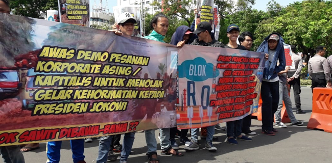 Koordinator aksi Abdillah menyebutkan, aksi yang kontroversi menolak pemberian gelar kehormatan kepada Presiden menjadi tanda tanya, bahkan berpotensi beraroma politis.