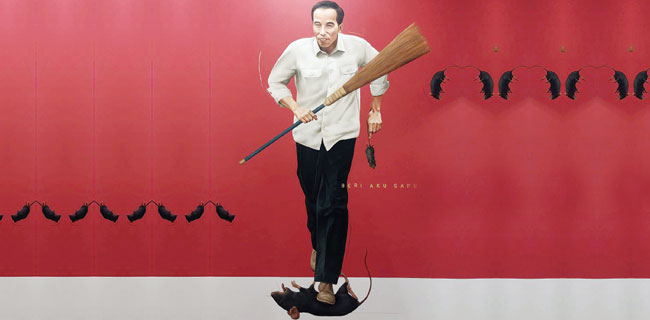 Di tangan kanan, Jokowi memegang sapu lidi. Di tangan kirinya, Jokowi memegang tikus kecil. Yang dipegang ekornya. Tak itu saja, suami Iriana itu juga menginjak tikus dengan kaki kirinya.