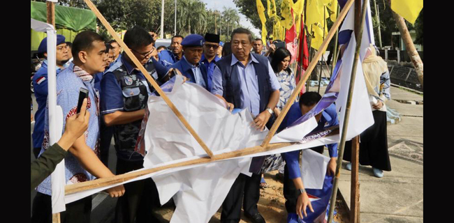 "Untuk kepentingan rakyat Indonesia yang kita cinta, saya minta turunkan bendera Partai Demokrat, baliho saya di Pekanbaru, daripada dirobek dan dibuang ke parit," kata SBY.