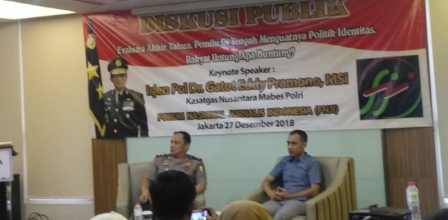 Demikian disampaikan Kasatgas Nusantara Polri Irjen Polisi Gatot Eddy Pramono dalam diskusi publik dengan tema "Evaluasi Akhir Tahun, Pemilu di Tengah Menguatnya Politik Identitas, Rakyat Untung apa Buntung? oleh Forum Nasional Jurnalis Indonesia (FNJI) di Jakarta, Kamis (27/12).