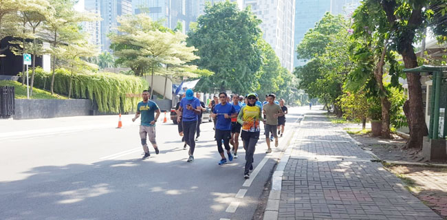 Saat berlari, mantan wakil gubernur DKI Jakarta itu mengenakan baju kaus warna biru dengan tulisan “Berlari Untuk Berbagi' pada bagian depannya.