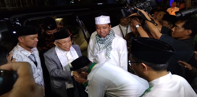 Maruf Amin tampak disambut hangat Ketua Umum PPP M. Romahurmuziy dan dicium tangannya oleh Sekjen Arsul Sani di pintu masuk kantor yang terletak di Jalan Diponegoro, Menteng, Jakarta, Minggu (6/1).