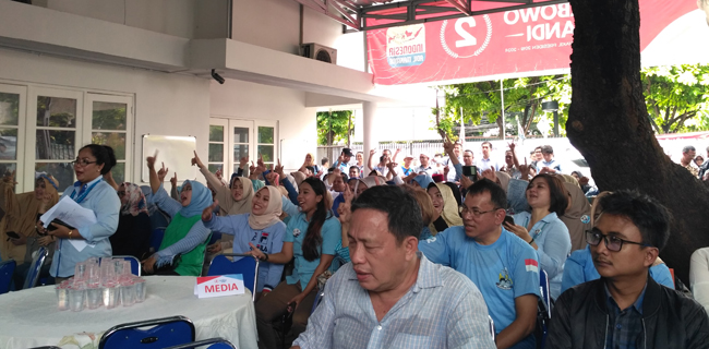 Mendengar cerita dari Taufik, para relawan yang hadir langsung meneriakkan nama Prabowo-Sandi sembari mengacungkan salam dua jari.