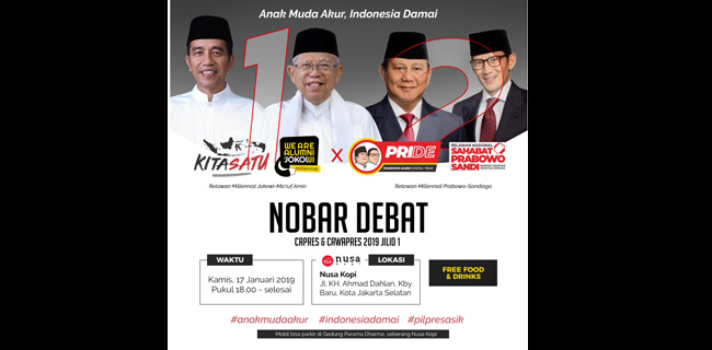 Kegiatan tersebut mengusung tema "Anak Muda Akur, Indonesia Damai" yang dipersembahkan Kitasatu dan Alumni UI Millennial untuk Jokowi-Amin bersama Prabowo Sandi Digital Team (Pride) dengan Relawan Nasional Sahabat Prabowo Sandi.