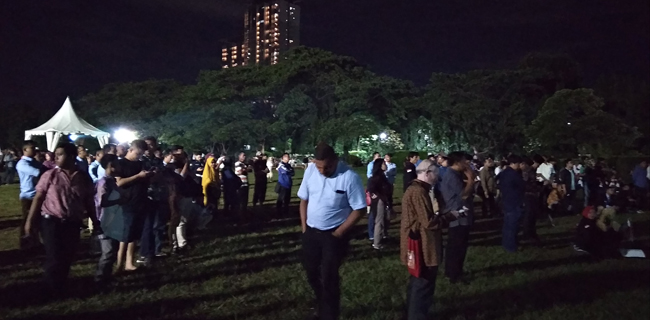 Ratusan orang sebelumnya antusias berkumpul untuk nonton bareng debat pilpres perdana melalui layar lebar berukuran 4x6 meter yang disediakan Komisi Pemilihan Umum.