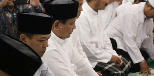 Prabowo menempati shaf paling depan tepat di belakang imam.