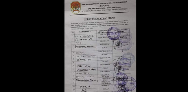 Dalam surat dengan kop surat Perkumpulan Aparatur Pemerintah Desa Seluruh Indonesia (Papdesi) tersebut, ada 15 nama menyatakan diri bersedia untuk menyukseskan sekaligus memenangkan pasangan 01 pada Pemilu 2019.