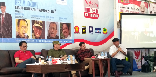 "Kita berikan piala kepada Jokowi lewat Bawaslu sebagai paling juara nomor 1 melakukan kebohongan. Ini presiden pembohong. Amat sangat jelas pembohongannya," tegasnya saat menjadi pembicara di diskusi bertajuk "Rezim Jokowi Mau Menghidupkan Dwifungsi TNI?" di Kantor Sekretariat Nasional (Seknas) Prabowo-Sandi, Menteng, Jakarta Pusat, Selasa (5/3).