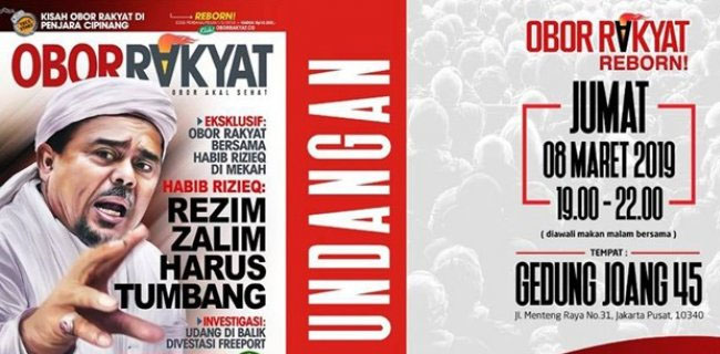 Obor Rakyat reborn. Dalam undangan nampak halaman muka Obor Rakyat yang siap beredar, antara lain berjudul "Habib Rizieq: Rezim Zalim Harus Tumbang" dan "Udang Di Balik Investasi Freeport".
