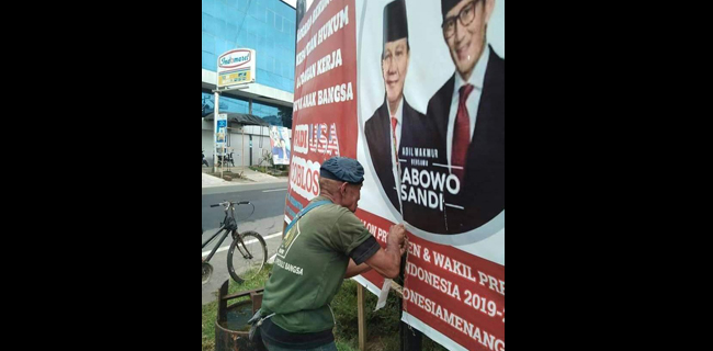 Dalam foto itu tampak seorang kakek menjahit baliho Capres dan Cawapres nomor urut 02 Prabowo Subianto-Sandiaga Uno yang sedang dalam keadaan robek.