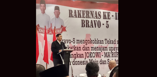 Dalam kesempatan itu, Menko Bidang Kemaritiman Luhut Binsar Panjaitan menjelaskan, meski berdasarkan hasil berbagai survei pasangan Jokowi-Maruf sudah unggul di semua provinsi, para relawan Bravo 5 agar tidak berpuas diri.