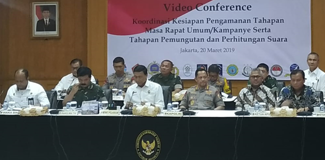 . Menteri Koordinator Bidang Politik, Hukum dan Keamanan (Menko Polhukam) Wiranto memimpin rapat bersama Kapolri, Panglima TNI, Ketua KPU dan Ketua Bawaslu.