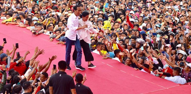 Jokowi tampak sibuk mengambil gawai pendukungnya untuk berfoto selfie. Sementara Iriana yang berada di samping kanan Jokowi terlihat menyiapkan pose agar masuk dalam frame kamera. Tapi tangan kanan ibu negara itu masih melayani salaman dengan para pendukungnya.