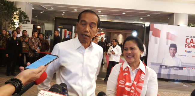 Jokowi yang tiba di lokasi sekira pukul 19.45 WIB didampingi sang istri Iriana Jokowi mengenakan baju kompak putih-putih lengan panjang langsung menyapa awak media.