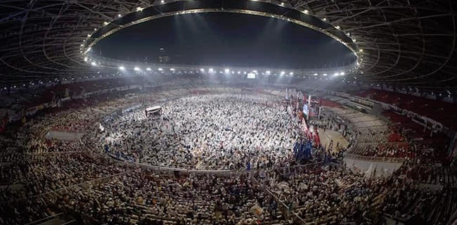 "Lautan manusia pagi ini, syukur kepada Allah SWT. Insya Allah meskipun banyak tantangan tapi sudah lebih sejuta berkumpul di GBK. Maka InsyaAllah kita hadirkan Indonesia menang adil makmur amin," ujar Sandi dari atas panggung utama SU-GBK, Jakarta, Minggu (7/4).