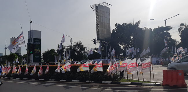 Di lokasi acara dan di sepanjang jalan kawasan GBK, sudah banyak terpasang bendera, spanduk, baliho alat peraga kampanye Jokowi-Maruf dan partai politik pengusung.