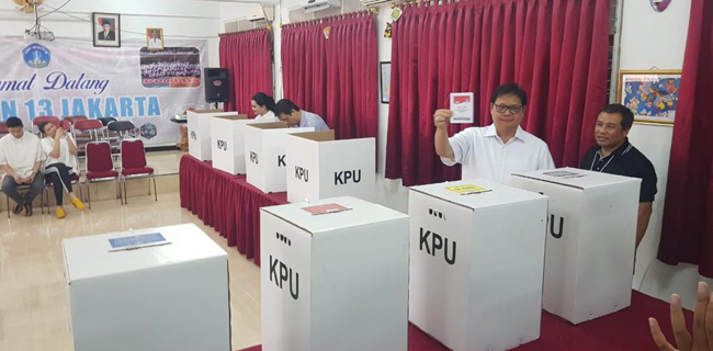 Ketua Umum Partai Golongan Karya (Golkar) Airlangga Hartanto mencoblos di Tempat Pemungutan Suara (TPS) 005 SMPN 13, Kebayoran Baru, Jakarta Selatan, Rabu (17/4).