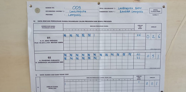 Berdasarkan Form C1 Presiden dan Wakil Presiden yang diterima redaksi, Rabu (17/4), Prabowo-Sandi memperoleh 91 suara. Sementara Paslon 01 Jokowi-Ma'ruf hanya memperoleh 26 suara.