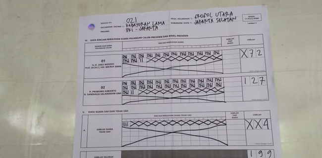 Tiga TPS di Kelurahan Grogol Utara, Kebayoran Lama, Jakarta Selatan, paslon 02 Prabowo Subianto-Sandiaga Uno menang banyak dari paslon 01 Joko Widodo-Maruf Amin.
