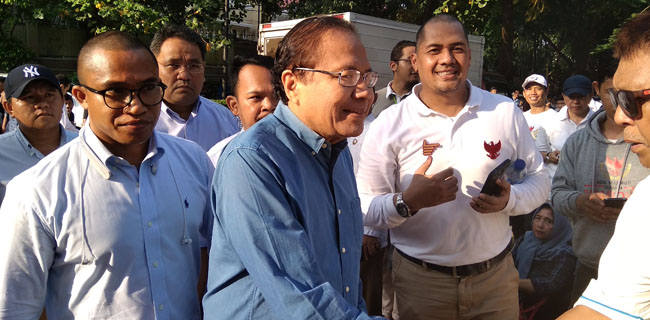 Rizal berjalan kaki kurang kurang 50 meter dari zona steril jalan utama menuju kediaman Prabowo. Saat ditanya soal hasil hitung cepat Pilpres dari sejumlah lembaga survei, Rizal enggan berkomentar dahulu.