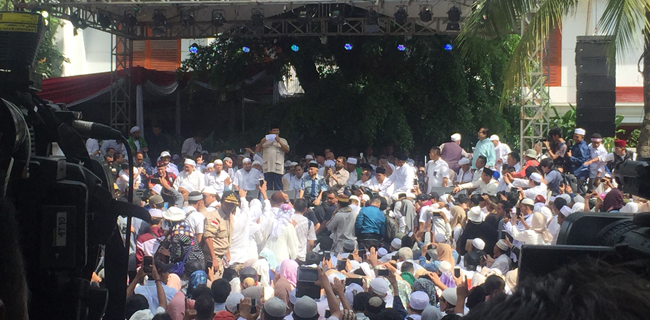 “Mereka ingin menuduh bahwa kita mungkin punya niat-niat yang aneh-aneh. Tidak ada yang aneh-aneh kita ingin tegakkan kebenaran dan keadilan, berkumpul dijamin oleh konstitusi kita,†ujarnya. []