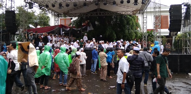 Bukan beranjak, massa tetap berkumpul sembari mengumandangkan adzan tanda ibadah salat ashar siap digelar walaupun diiringi rintik hujan.