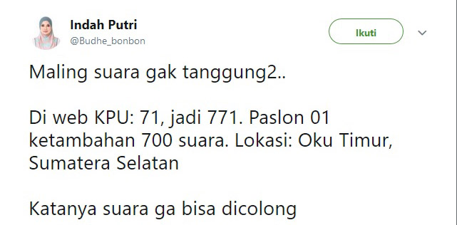 Dugaan kecurangan dalam proses input data C1 ke portal Sistem Informasi Perhitungan Suara (Situng) terus terungkap. Kali ini, terjadi di TPS 01 Desa Girimulya, Kecamatan Belitang Jaya, Oku Timur, Sumatera Selatan.