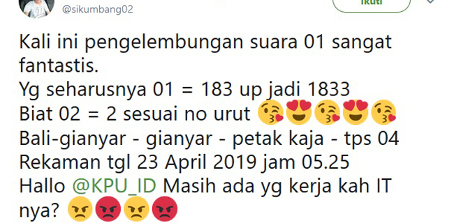 Antusiasme masyarakat dalam mengawal rekapitulasi suara dan memantau input data dari form C1 ke portal Situng KPU seakan tak pernah surut. Dari waktu ke waktu, mereka selalu menemukan kejanggalan angka, yang kesemuanya merugikan Paslon 02.