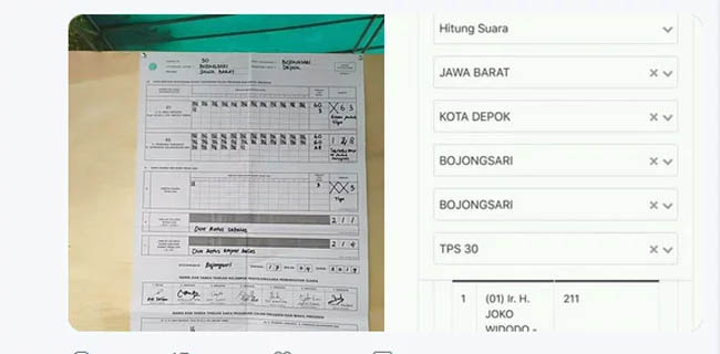 Contoh lainnya di TPS 30, Bojongsari, Depok, Jawa Barat seprti diungkap akun twitter @HaswanEvan. Ia menyebut, berdasarkan form C1 paslon 01 seharusnya mendapat 63 suara, sedangkan paslon 02 mendapat 148 suara.
