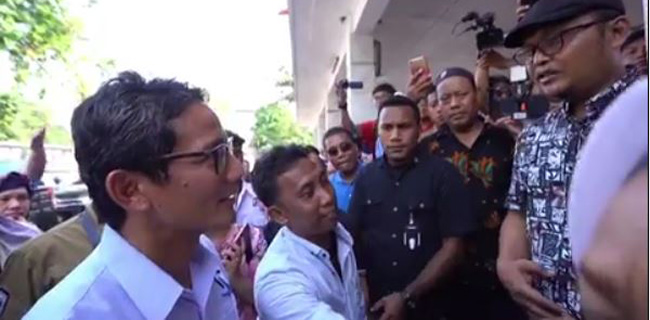Saat tiba di lokasi, Sandi yang megenakan kemeja biru muda ini disambut hangat oleh masyarakat. Sandi pun sempat berbincang dengan beberapa pihak yang berada di lokasi.