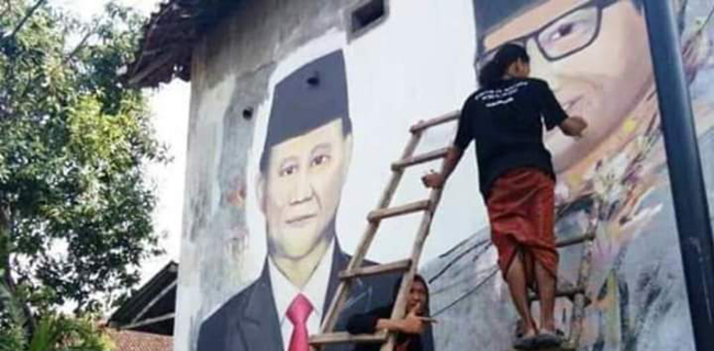 Tampak dalam foto itu, dua orang pria berkaus hitam dengan berdiri di tangga kayu tengah melukis wajah Prabowo dan Sandiaga di dinding rumah seorang warga.