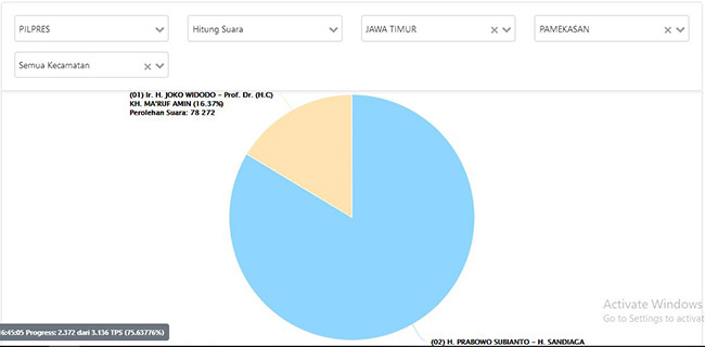 Data KPUD Pamekasan ini pun tak jauh beda dengan hitungan KPU pusat berdasarkan Sistem Informasi Perhitungan Suara (Situng). Hingga pukul 21.22 WIB, Rabu (1/5), jumlah suara yang masuk di KPU tercatat sebanyak 2.372 dari 3.136 TPS atau sudah mencapai 75.637 persen.