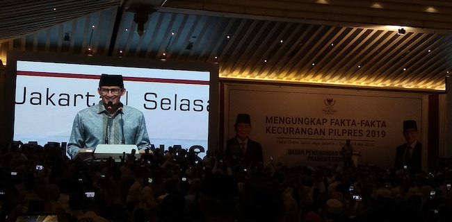 Begitu kata calon wakil presiden, Sandiaga Salahuddin Uno dalam orasi politik saat acara bertema “Mengungkapkan Fakta-fakta Kecurangan Pilpres 2019†yang digelar di Ballroom Grand Sahid, Jakarta, Senin (14/5).